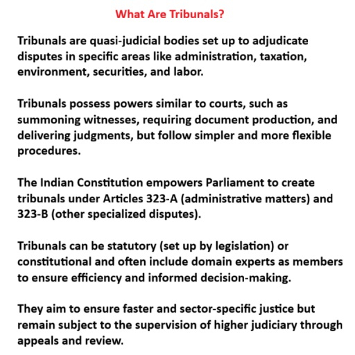 Tribunals are quasi-judicial bodies set up to adjudicate disputes in specific areas like administration, taxation, environment, securities, and labor.