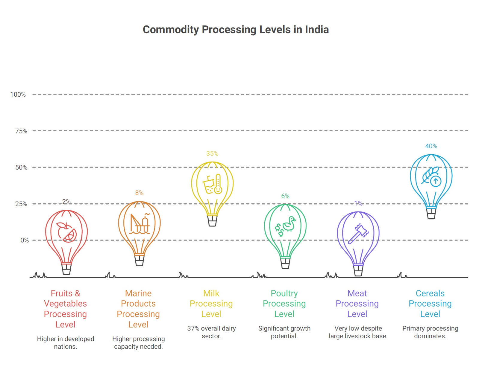 Challenges: Low processing levels (2% F&V), 75% unorganized sector, post-harvest losses (Rs 92,651 crore annually), cold chain deficit, regulatory compliance costs.