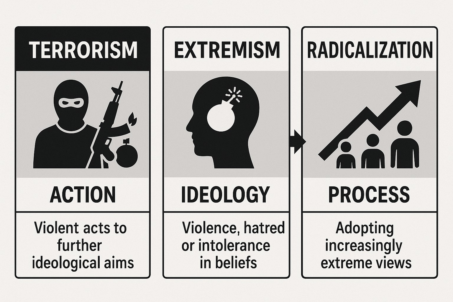 | Manifestation | Violent attacks on civilians/state | Ideological worldview promoting violence | Gradual adoption of extreme beliefs |